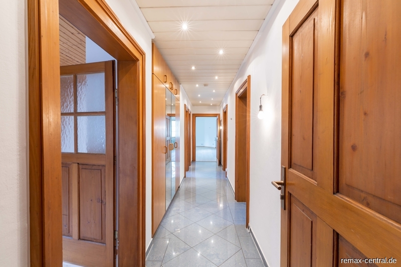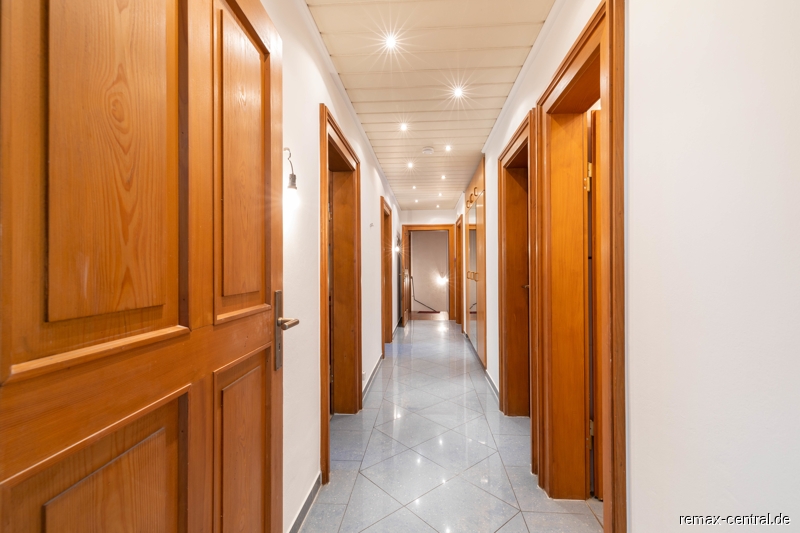 Bei Eingang der linksseitigen Wohnungseingangstüre betritt man einen geräumigen, modern gefliesten Flur, an der alle übrigen Zimmer angelegt sind. Direkt gegenüber befindet sich das imposante Wohnzimmer, das mit einem Eichen-Landhausdielenboden ausgelegt ist und mit der Wärme des außergewöhnlichen Eck-Kamins für eine harmonische Behaglichkeit sorgt. Die vielen Fenster im Wohnbereich schaffen eine helle und freundliche Atmosphäre.