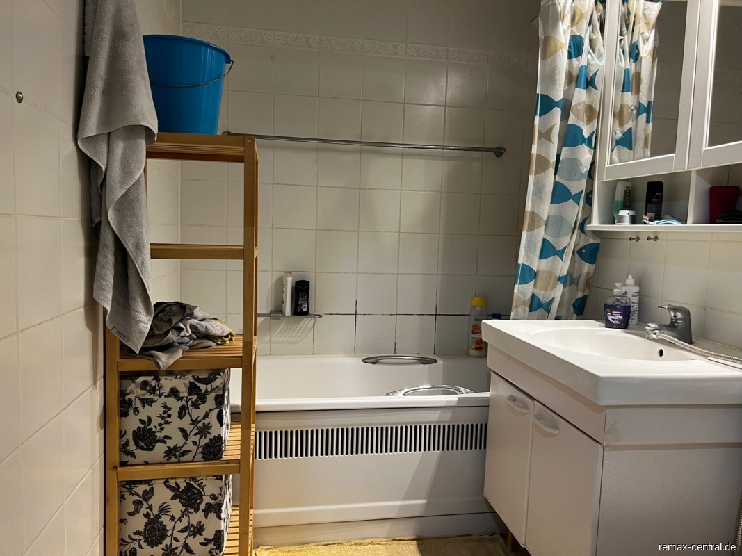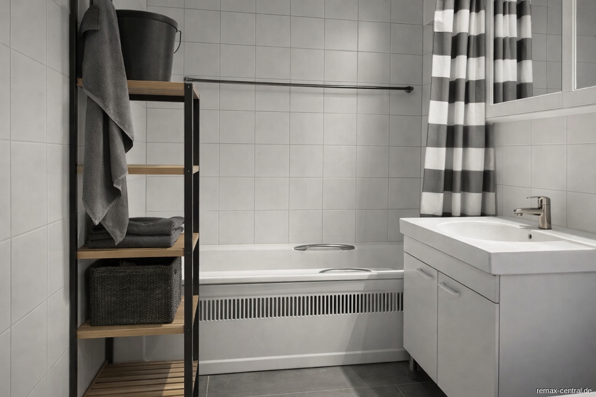 Das hell geflieste Bad mit WC verfügt über eine Badewanne. Der Heizkörper ist platzsparend hinter der Badewannenverkleidung angebracht.