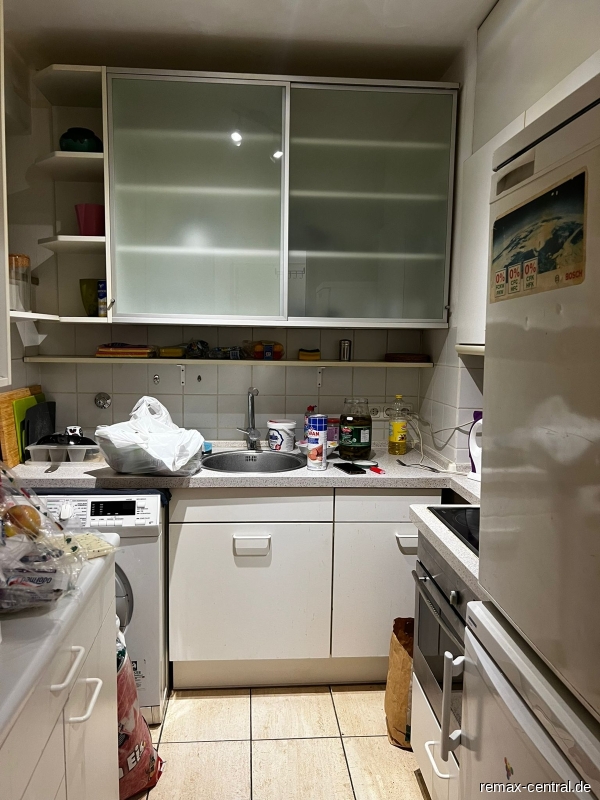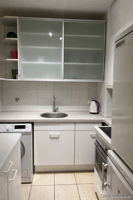 Die Einbauküche ist mit Cerankochfeld-, Herdkombination, Kühl- Gefrierschrank sowie einem Waschmaschinenanschluss ausgestattet.