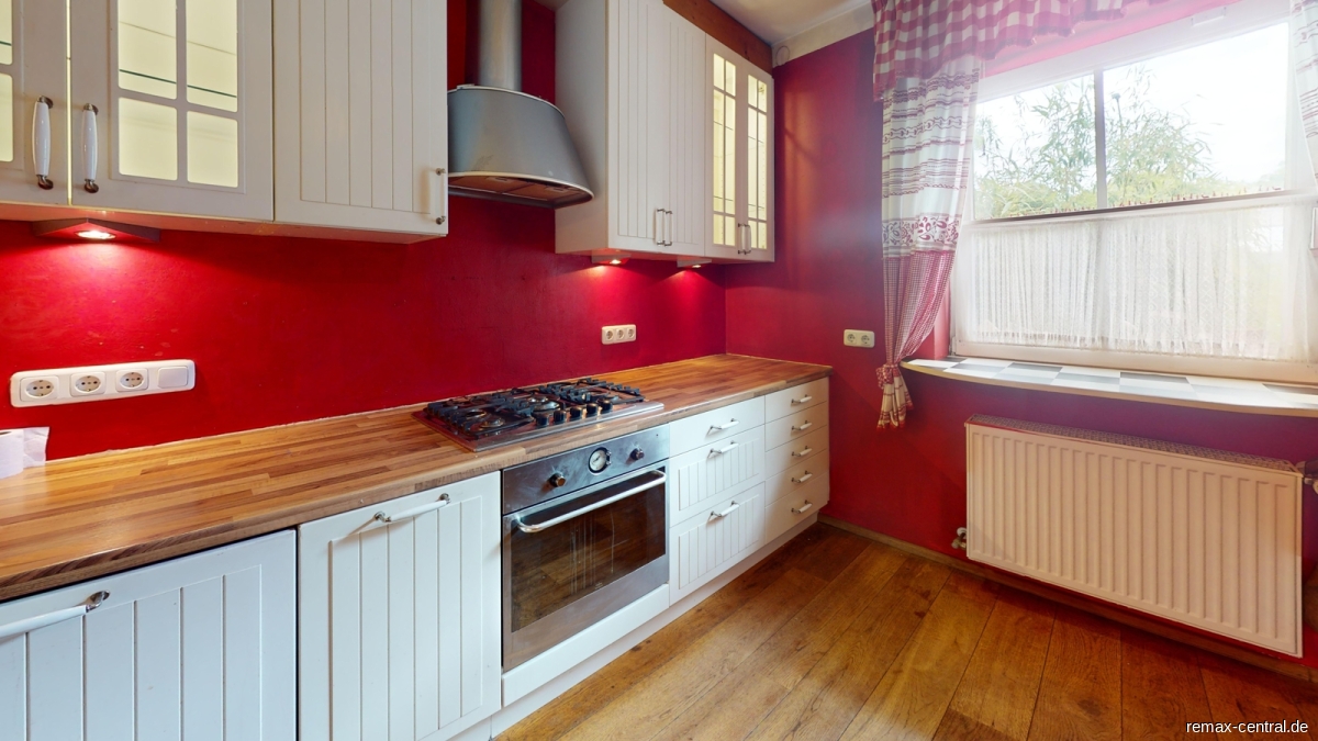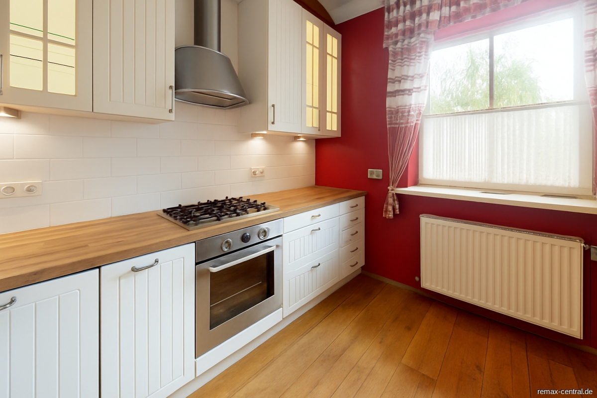Ein paar Stufen führen Sie ins Hochparterre – durch den Eingang betreten Sie zunächst einen zentralen Flur, von dem alle Bereiche aus erreichbar sind. Die separate Küche im Landhausstil mit Gaskochfeld bietet großzügig Platz für alle Gelegenheiten – ob entspanntes Frühstück mit der Morgenzeitung, ausgiebiger Brunch am Wochenende oder das festliche Abendessen mit Gästen.