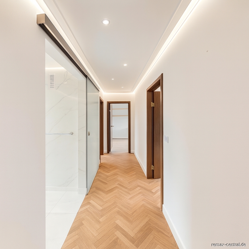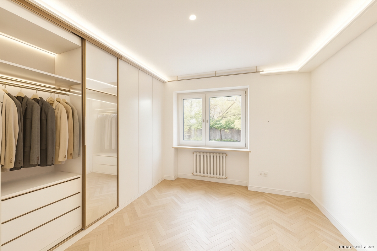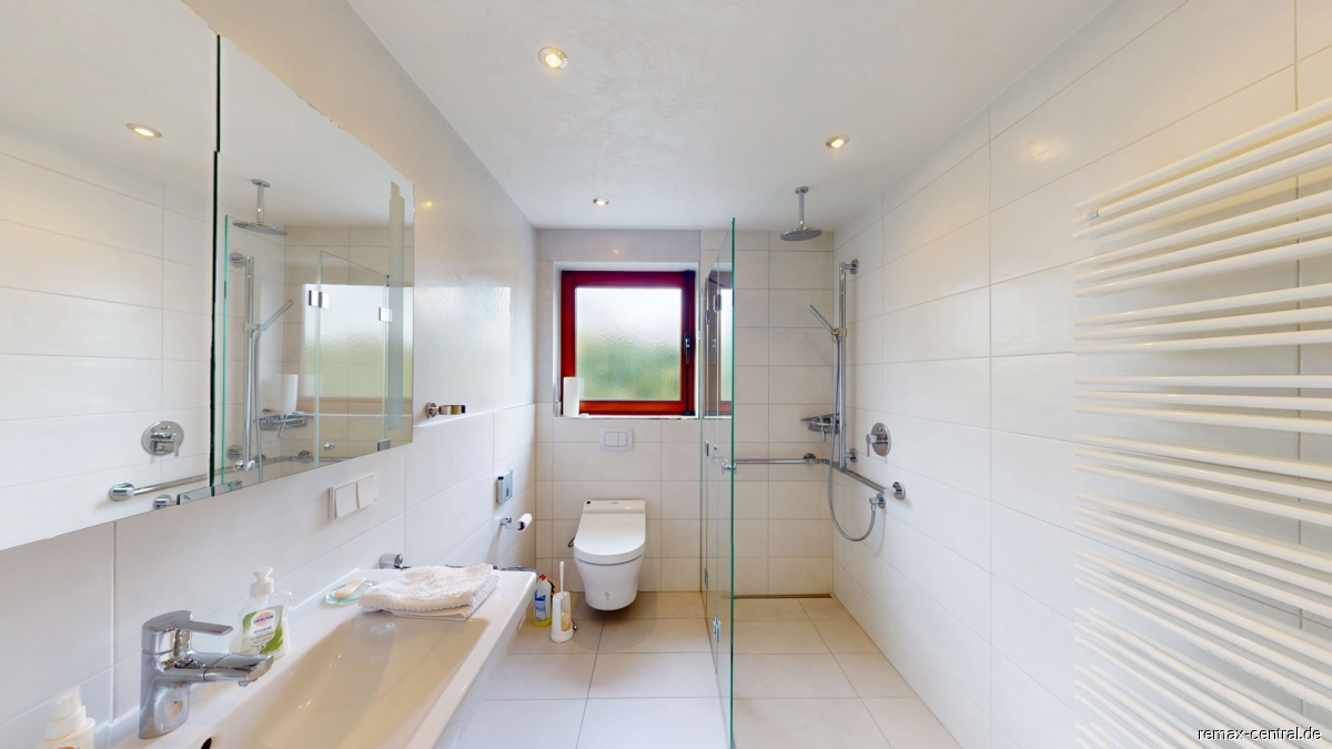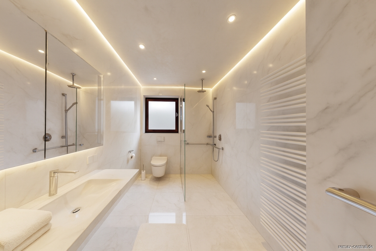 Die Ausstattung zeigt sich abwechslungsreich: Neben modernen Bädern mit Glasduschabtrennungen findet sich ein zusätzliches Gäste-WC, dessen individuelle Gestaltung dem Haus eine besondere Note verleiht. Stauraum ist reichlich vorhanden – von hochwertigen Einbauschränken bis hin zu Vitrinen. Die Küche ist klassisch gehalten und bietet viel Potenzial für eine moderne Neugestaltung nach Ihren persönlichen Vorstellungen.