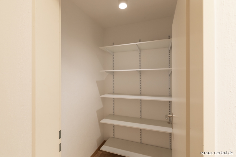 Zusätzlichen Stauraum bietet eine mit Regalen ausgestattete Abstellkammer.