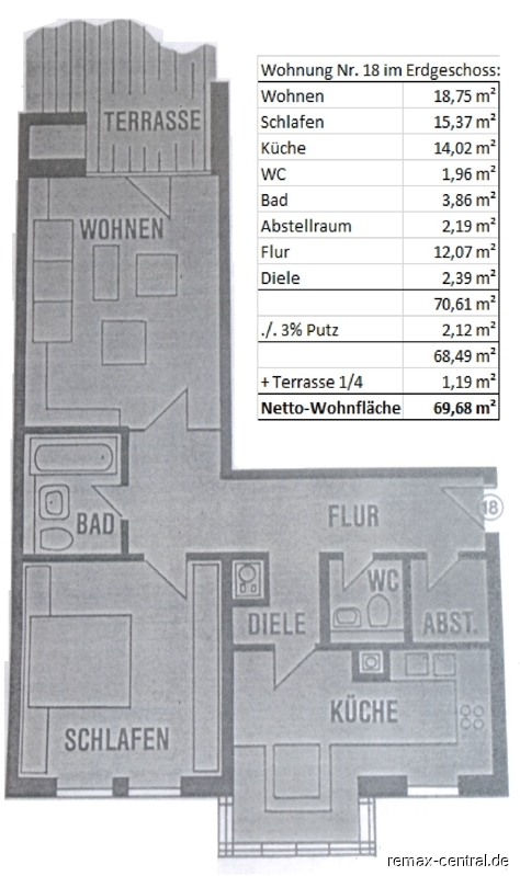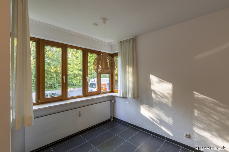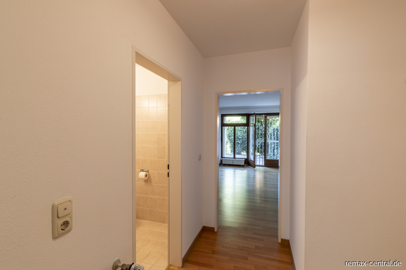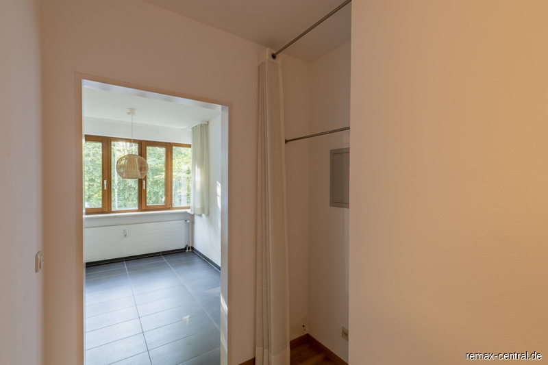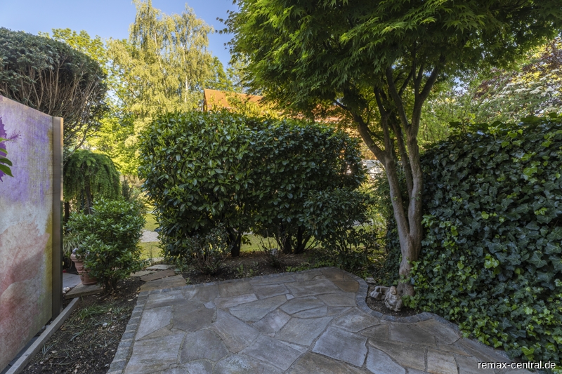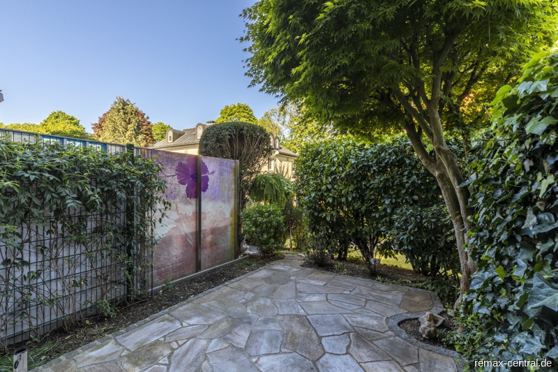Sowohl das Wohn- als auch das Schlafzimmer sind beide sehr hell und mit Echtholzparkett ausgestattet. Vom Wohnzimmer hat man direkten Zugang zu einer mit dekorativen Natursteinen gefließten, durch Trennwand und viel Grün vor Blicken geschützten Terrasse.