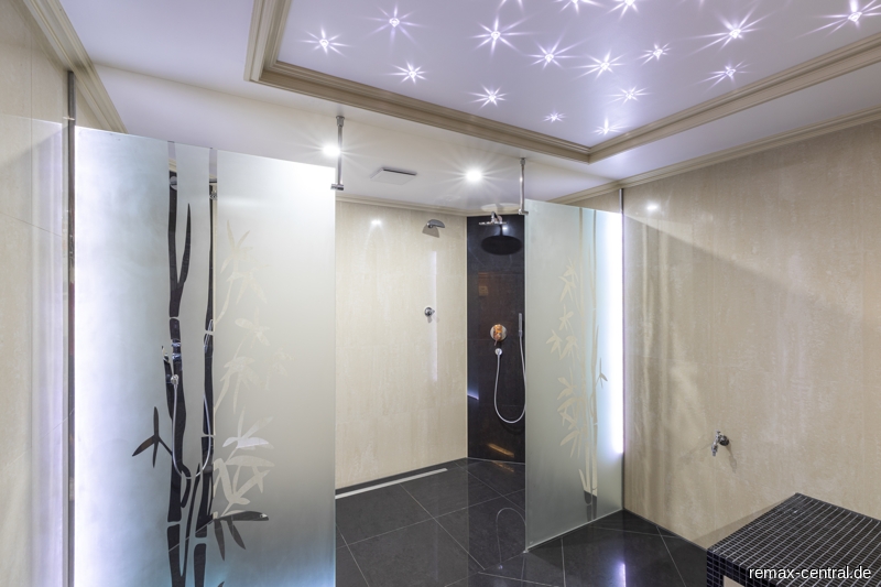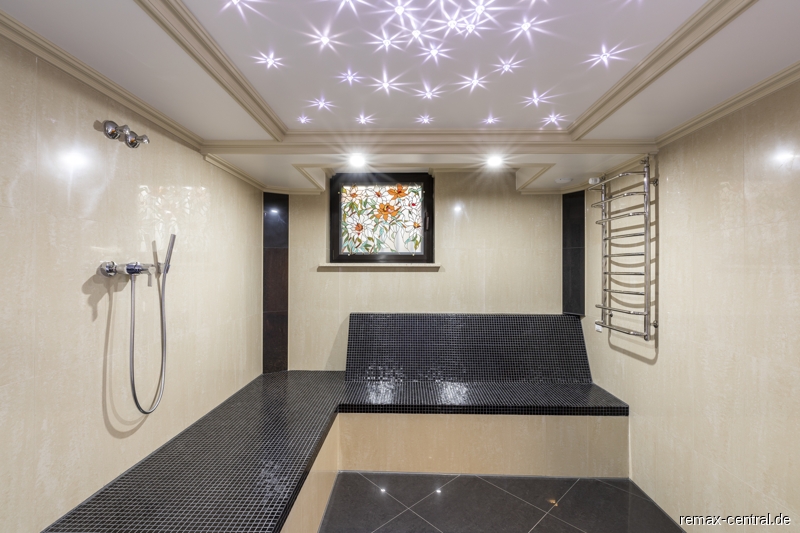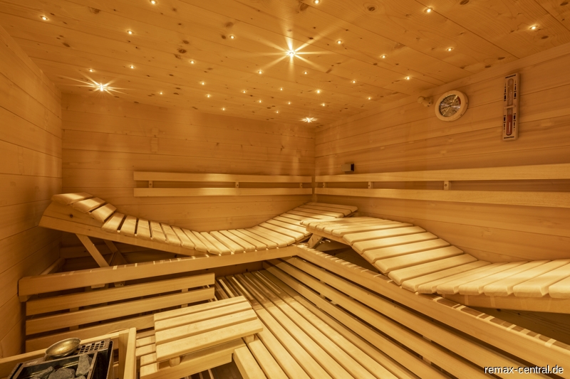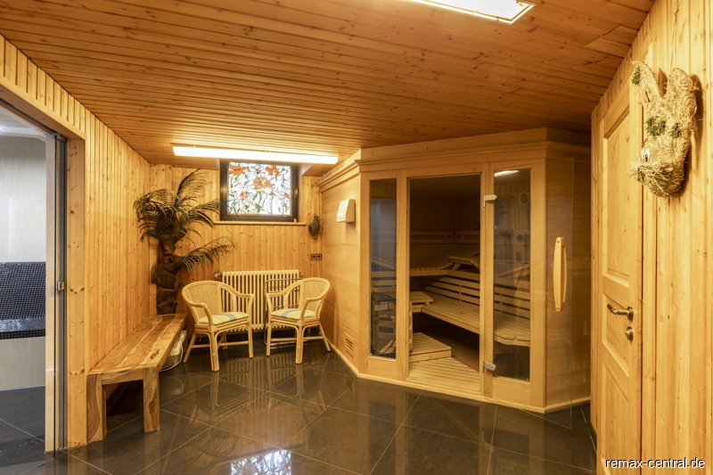 Im ausgebauten Untergeschoss kann man im Wellnessbereich mit großer Sauna, Wellnessdusche und Ruhe-Oase die Seele baumeln lassen.