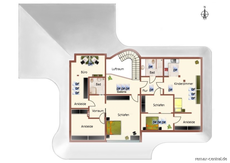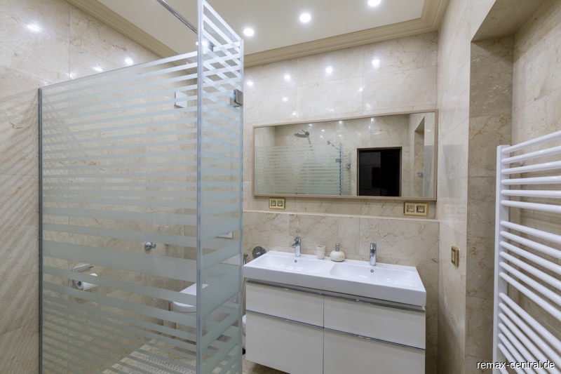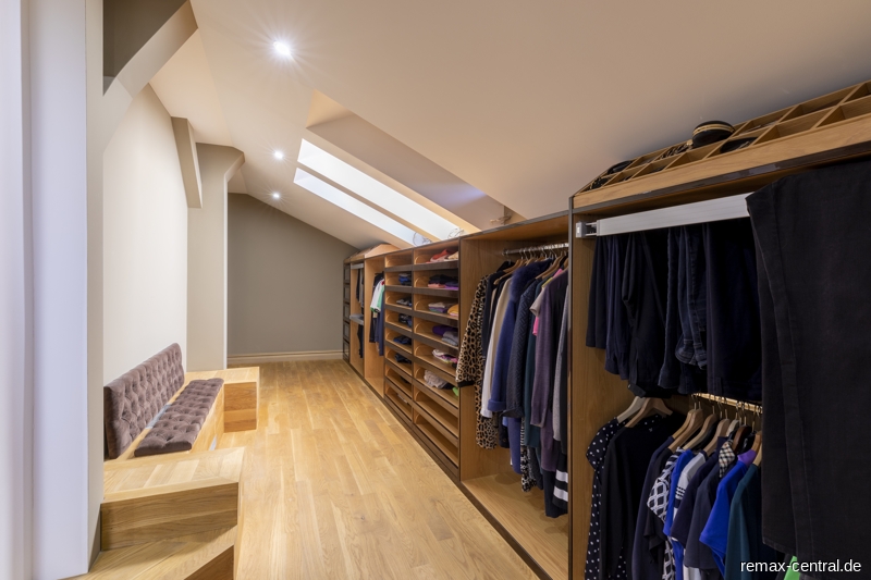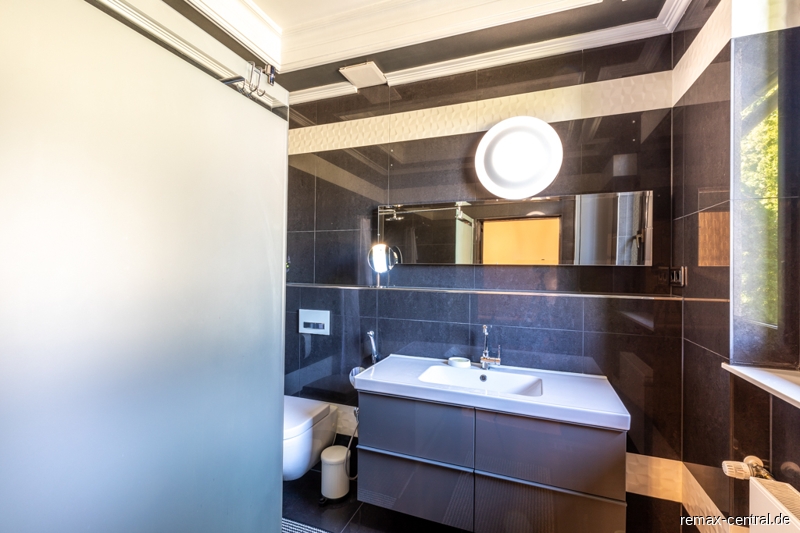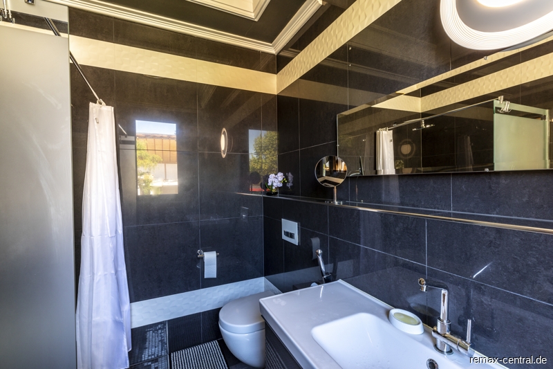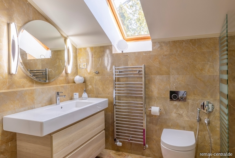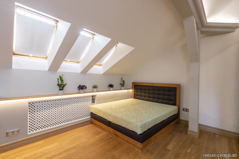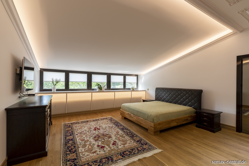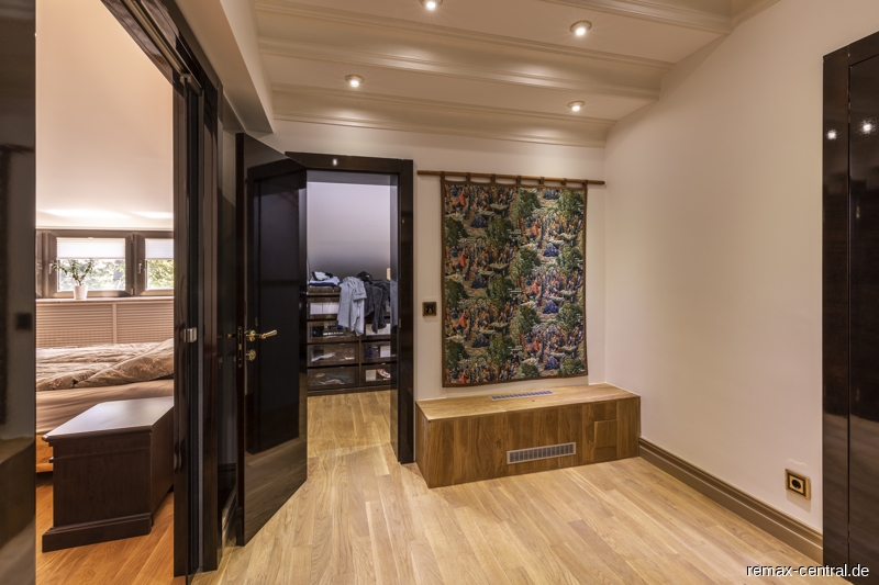 Ein runder Treppenaufgang führt zu den exklusiven Schlafräumen. Durch die helle Galerie im Obergeschoss gelangt man zu dem Master-Bedroom mit einem eigenen Luxus-Bad und einem direkten Zugang zur begehbaren Ankleide. Des Weiteren befinden sich hier ein großräumiges Schlafzimmer mit eigenem Küchenanschluss und ein drittes Schlafzimmer mit einem eigenen Ankleideraum. Das zweite Bad mit noblen Design-Elementen unterstreicht die hochwertige Ausstattung dieser Etage.