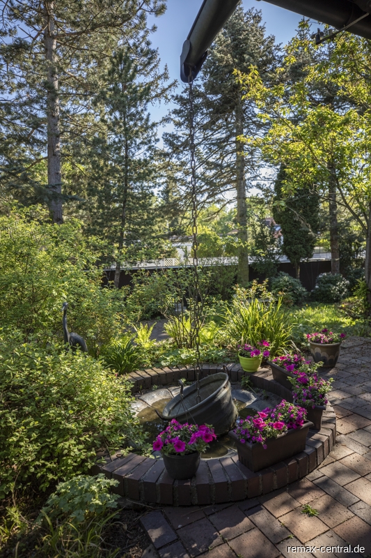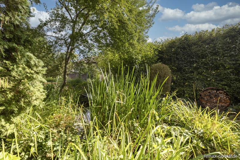 Der Teich mit Fischen und Wasserpflanzen verleihen dem nicht einsehbaren und eingewachsenen Garten durch raffinierte Beleuchtung sein besonderes Flair.