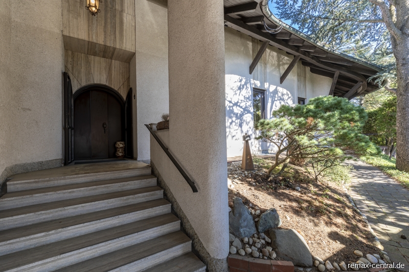 Das Entrée präsentiert sich mit Understatement. Von außen kann man auf diese Weise zunächst kaum erahnen, dass sich hinter den Gartenmauern und dem unscheinbaren Eingangstor ein gigantisches Anwesen, stilvolle Details, Wohneleganz und hochwertige Bauausführung verbergen.
