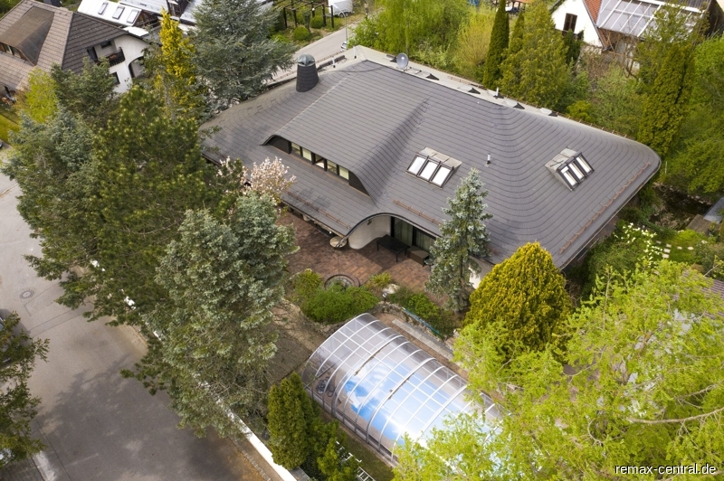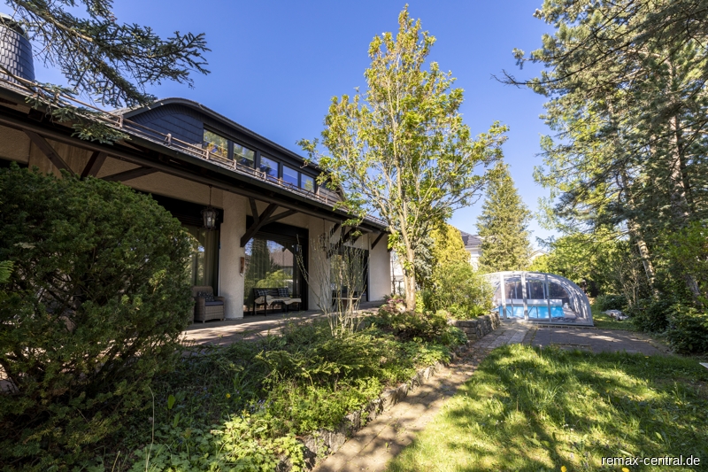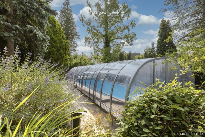 Das gärtnerisch wunderschön angelegte Grundstück mit einem Swimmingpool für vier Jahreszeiten und kleinem Teich unterstreicht die exklusive Villenarchitektur.