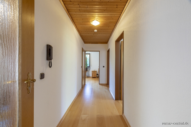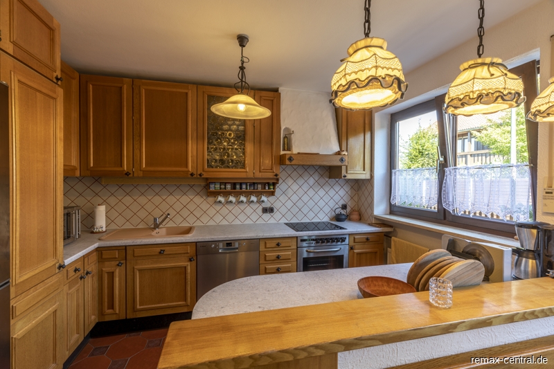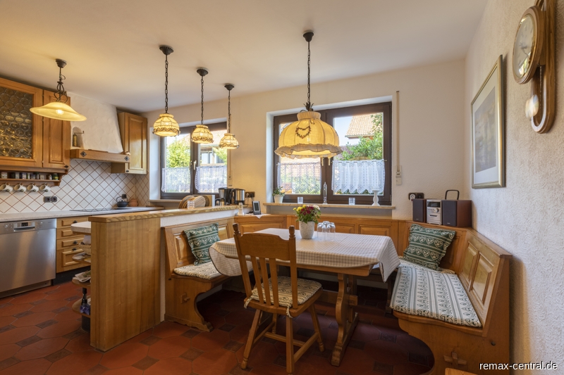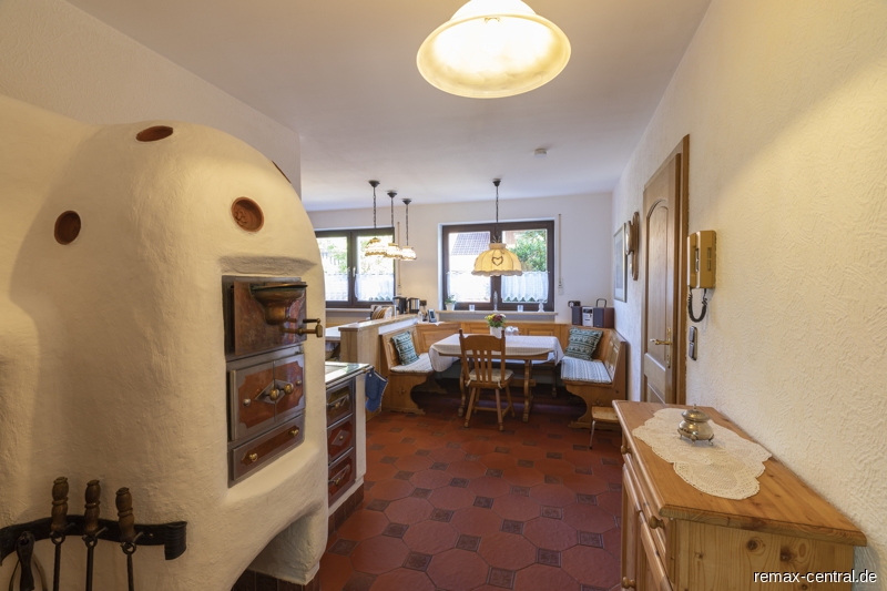 Dieses geräumige Einfamilienhaus mit ca. 197 m² Wohnfläche bietet freie Entfaltungsmöglichkeiten.Der Zutritt in das Haus erfolgt durch eine hochwertige Hauseingangstüre mit personifiziertem Fingerabdruck-Scan. Im Empfangsbereich befindet sich eine kleine Garderobe, das Gäste-WC und das Treppenhaus zu den oberen Geschossen. Das Herz des Hauses ist die einzigartige Küche mit hochwertigen Massivholzschränken, einem geschlämmten Aufsatzherd (Grundofen mit Kochplatte) zugehörig zum Kachelwarmluftofen mit Lüftungskacheln und Nachheizfläche mit Schamottsteinen. Der großzügige Essbereich bietet viel Platz für die Familie und auch Gäste. Vom Eingang bis zur Wohnküche findet man durchgängig pflegeleichten Bodenbelag aus Keramikfliesen.