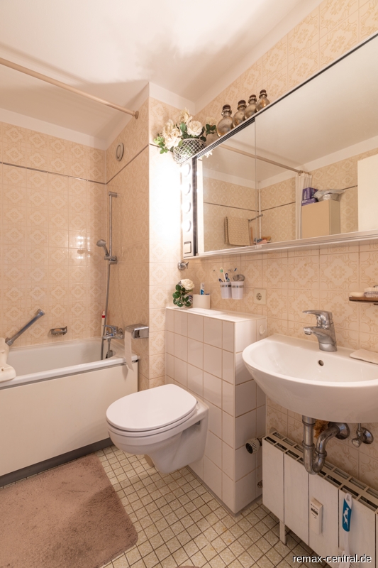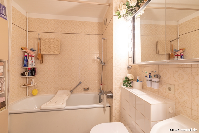 Schlaf- und Kinderzimmer sind über einen kleinen Flur mit dem Bad verbunden, das mit Wanne und WC ausgestattet ist.