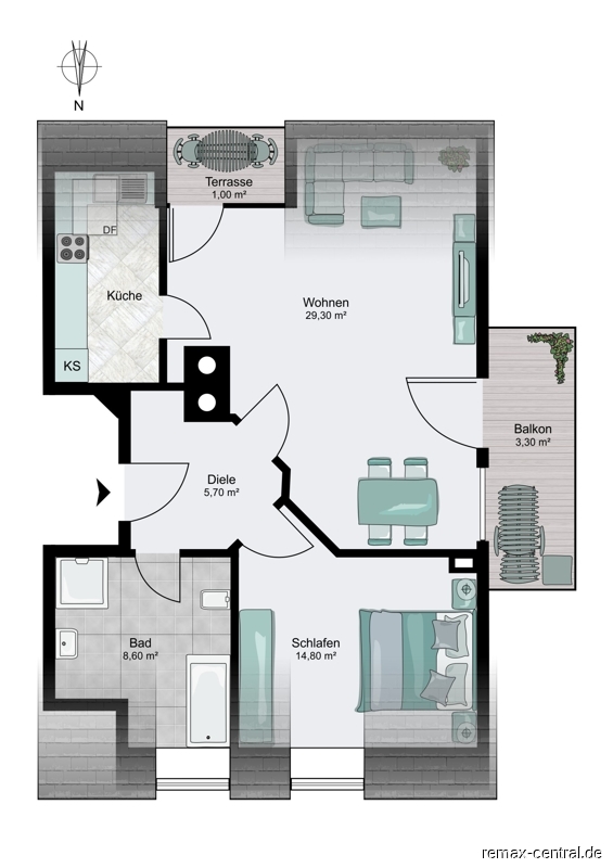 Neben einem Balkon verfügt die Wohnung auch noch über eine kleine, windgeschützte Terrasse.