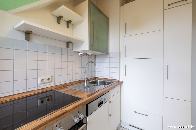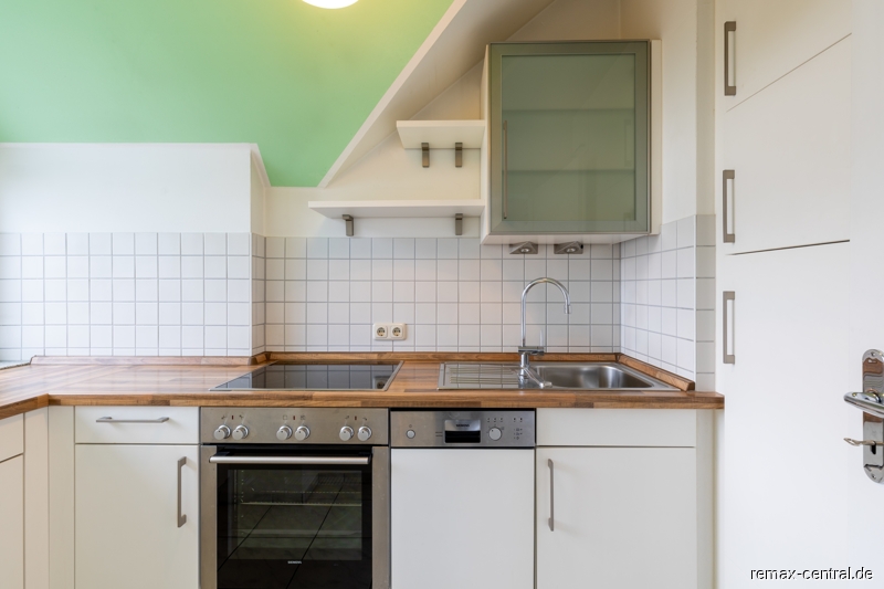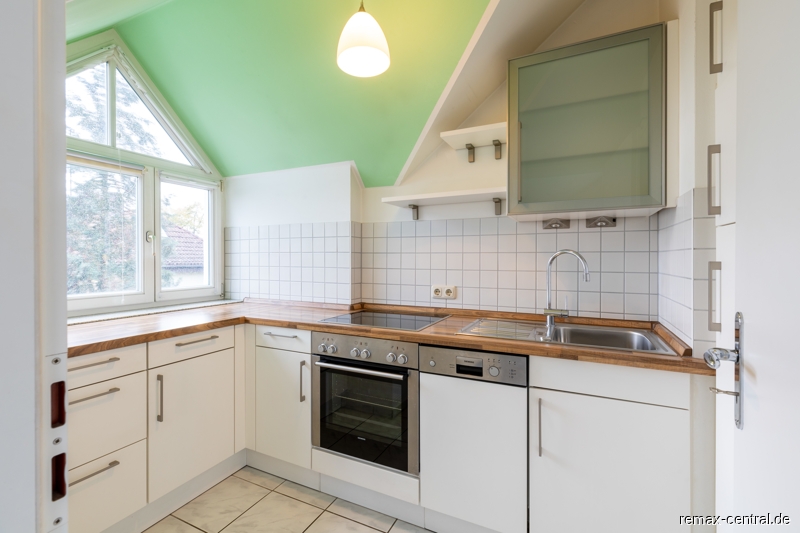 Die neuwertige Einbauküche ist speziell den Dachschrägen angepasst. Hier können sich Hobbyköche optimal ausleben.