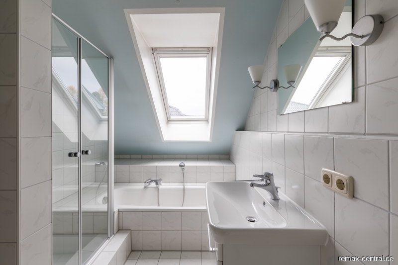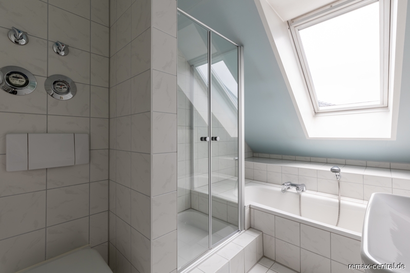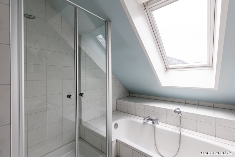 Das helle Bad ist modern gefliest und mit Badewanne sowie zusätzlicher Dusche ausgestattet.