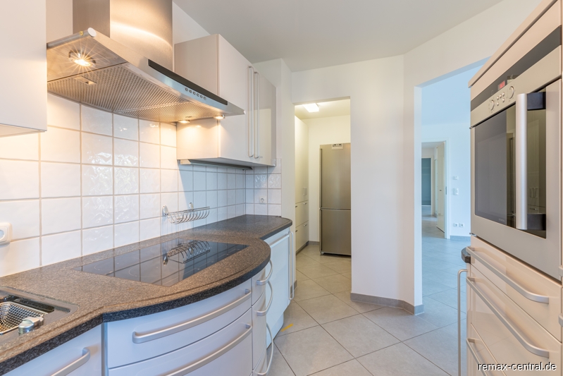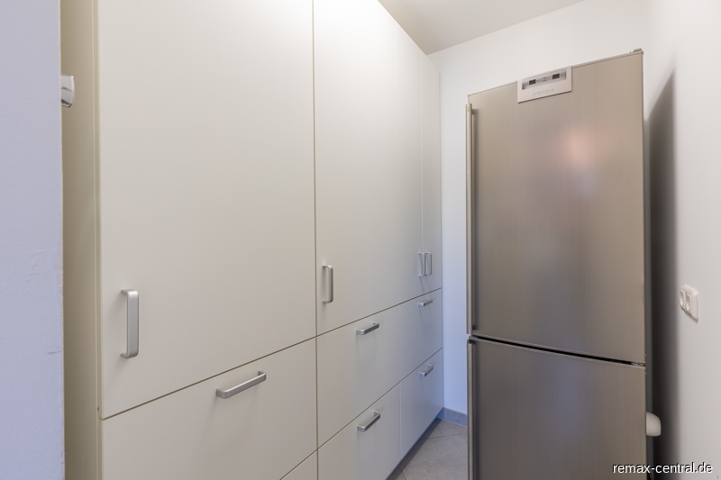 Die Einbauküche beeindruckt durch hochwertige Ausstattung, darunter ein Ceranfeld, eine Spülmaschine und eine Granitarbeitsplatte. Eine freistehende Kühl-Gefrierkombination komplettiert die Funktionalität. Von der Küche aus gelangen Sie in einen praktischen Hauswirtschaftsraum, der durch einen maßgefertigten Einbauschrank optimal genutzt wird.
