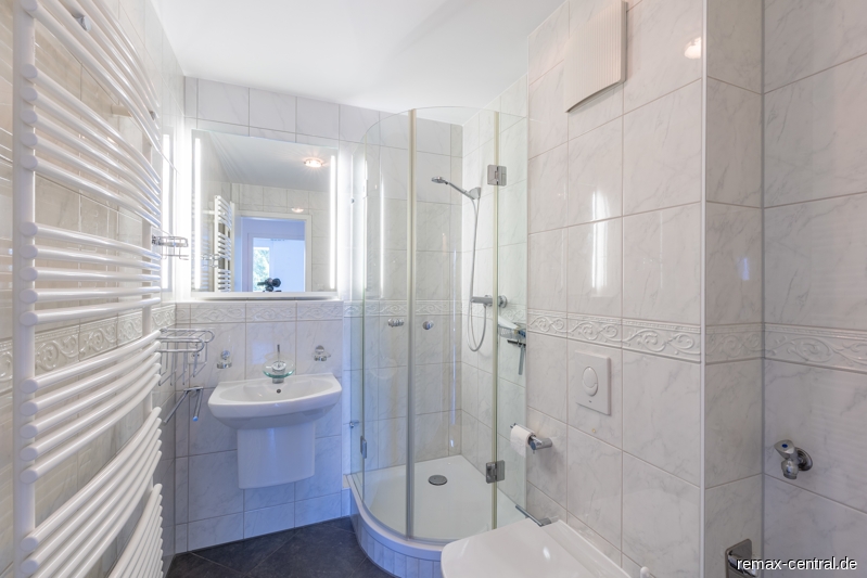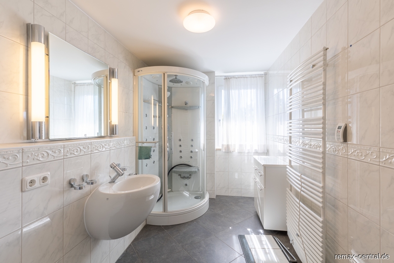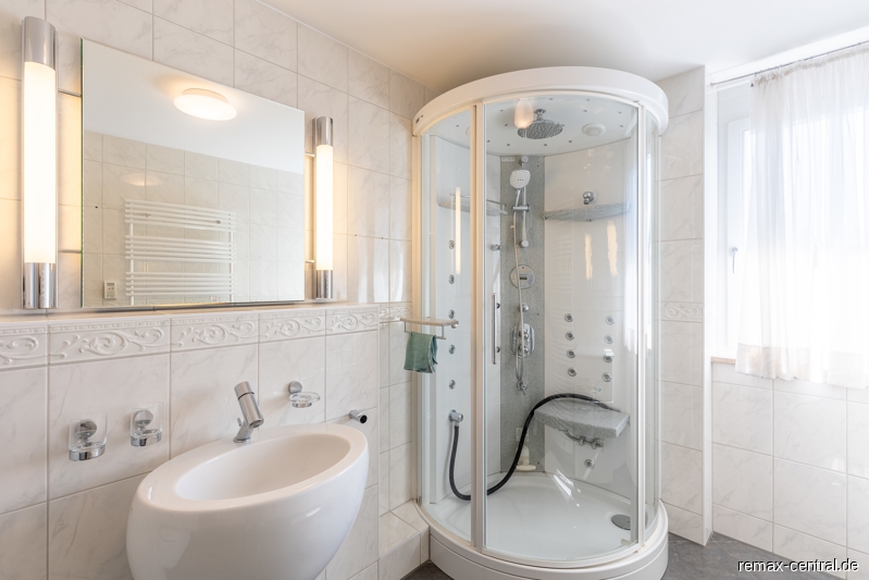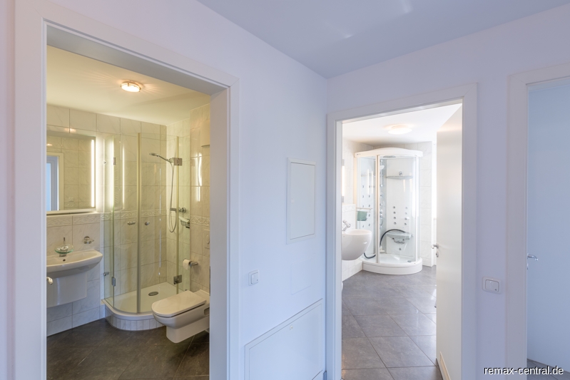 Zwei Badezimmer, beide mit Duschen ausgestattet, ergänzen den Wohnkomfort. Das Haupt-Badezimmer verwöhnt Sie mit einem Keramag Wellness-Dampfbad und erfreut sich an Tageslicht, das eine natürliche Helligkeit verströmt.